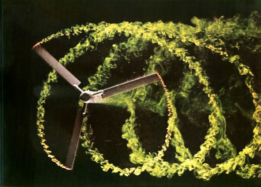 Colored emissions at the blade tips show the cycloidal shape of the vortices as well as their lengthwise distribution. In