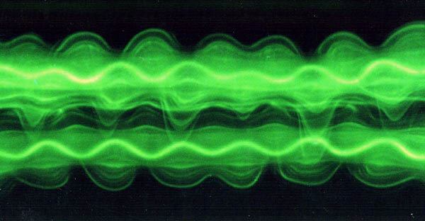 Here, the vortex pair is generated at the sharpened edges of two flat plates, hinged to a common base and moved in a prescribed symmetric fashion. Visualization is achieved using fluorescent dye. The evolution of the vortex pair was found to depend strongly on the vortex velocity profiles, which are determined by the motion history of the plates. We have identified at least three different length scales from our experiments, one of which we present in the photograph above. In this image, we demonstrate the development of a short-wave instability (wavelength less than one vortex separation). The remarkably clear visualization of the vortex core reveals its complicated internal structure, and the observed phase relationships show that the symmetry of the flow with respect to the midplane between the vortices is lost.