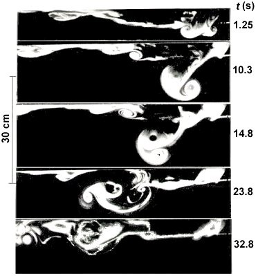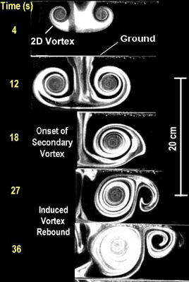 A rigid plate was placed below the exit slot to simulate the ground. As the vortex approaches the ground, the vortex separation increases (left pictures). A counter rotating secondary vortex begins to form beneath and outboard of the right primary vortex around t = 12 s. Its initial formation is not detectable, however, because there is no dye there to trace it. The presence of the secondary vortex becomes evident at t = 18 s as it grows in strength and size and entrains dye from the primary vortex. The perturbations of the primary vortex in the inviscid region of the boundary layer create an adverse wall pressure gradient slightly ahead of the primary vortex core, which retards the flow in the viscous local shear layer at the viscous-inviscid interface. The vorticity in the shear layer combines to form the secondary vortex and protrudes into the inviscid region, leading to local flow separation. As a result, the primary vortex begins to rebound at t > 12 s under the influence of the secondary vortex.