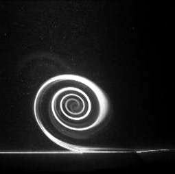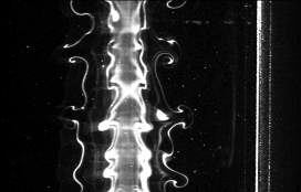 When a moving surface slides under a stationary one, the potential exists for a vortical structure to develop close to the junction if the velocity of the moving surface is sufficiently high. The mechanism for the formation of this structure is the convection of the boundary layer material formed on the moving wall over the stationary plate. This results in an unsteady wall jet on the stationary plate that separates and rolls into a vortical structure as shown in the figure. Experiments show that a centrifugal instability develops along the vortex core which results in the eventual turbulent breakdown of the structure.